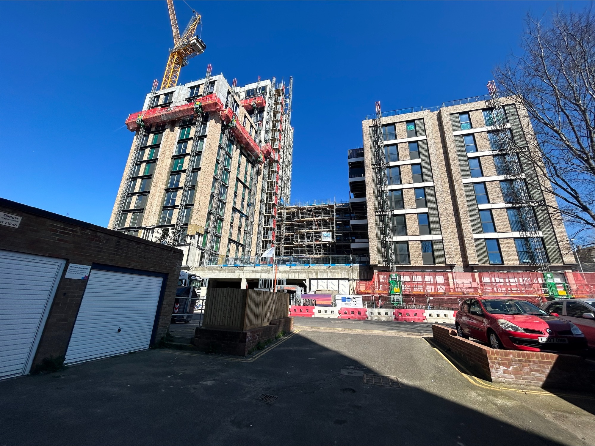 Installations have begun at Hove Gardens for RG Construction Group and Watkin Jones Group partnership. The development will have 216 apartments, including studios, one, two, and three-bedroom apartments, 324 cycle spaces, and 31 basement car parking spaces. The completion date is set for July 2023, and the development will feature ample amenity space, including a management suite, potential resident's gym, and home working spaces.